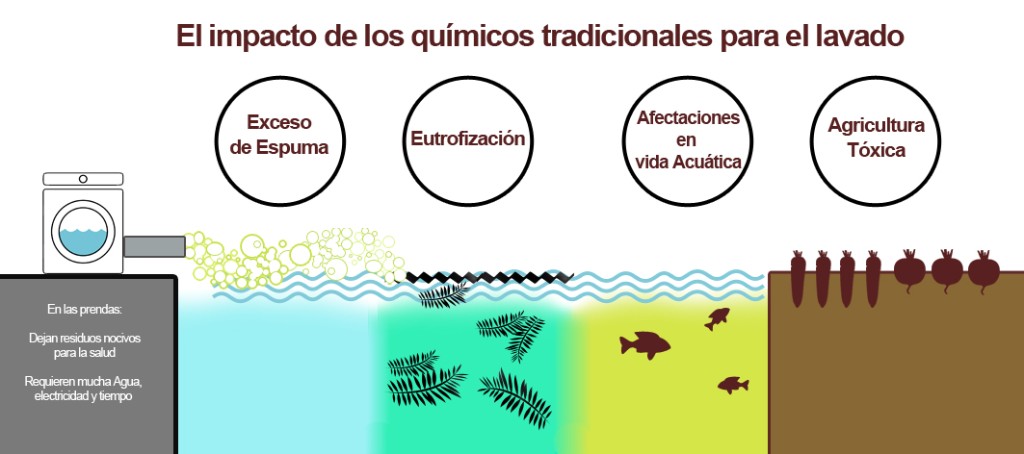 Evitas tirar más del 75% de químicos que efectivamente se van al afluente, esto impacta muchísimo, ya que disminuyes la saturación que tienen actualmente los ríos, lagos y en general el medio ambiente, facilitando que los productos realmente se biodegraden y permitan erradicar su impacto negativo.